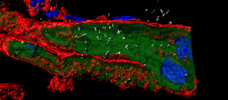 *Imagen: reconstrucción tridimensional de células de Purkinje cardíacas infectadas con el virus de la gripe. En verde se muestra el interior de las células en el tejido cardíaco. En rojo se muestra el contorno celular y en azul los núcleos de las células. El virus de la gripe aparece en blanco en el interior de las células./ CNB-CSIC